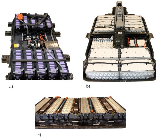 (a) battery pack of Mitsubishi i-MiEV; (b) battery pack of VW e-Up; (c) battery pack of smart fortwo electric drive. Note: scaled differently.