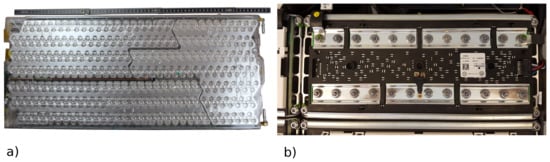 The second example is a battery pack taken from a smart fortwo electric drive (third generation, initial registration: September 2014), built by Deutsche Accumotive, which is shown in Figure 4c). It consists of 90 pouchbag cells, connected in series by welded connections. The cells are mounted in plastic frames, organized in three rows positioned side by side with cooling plates for a liquid cooling system mounted on top.