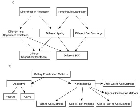 Several causes that lead to charge imbalance between serially connected battery cells can exist in a given system. Usually, a generic requirement would be to keep these low enough to not affect the system’s performance and reliability. Depending on the individual application, however, there might be special aspects that have to be taken care of, e.g., resulting from weight constraints (see, e.g., Section 3), or required charging currents that lead to balancing currents. Section 5 provides further information on the need to implement balancing and usual realization methods.