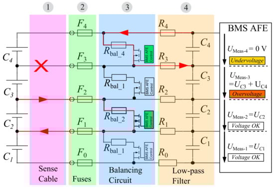 Redundancy, besides self-tests, signal monitoring, supply monitoring and watchdog timers, is a topic that increases reliability of a system according to the ISO 26262 standard [17]. Not all systems can be designed allowing a high grade of redundancy due to cost, limited time of design process or other limitations. However, cell voltages usually are observed redundantly to a certain level, as mentioned in paragraph “voltage acquisition”. This means there are at least two separate information sources. Usually, there is a main chip that can measure the cell voltages very accurately. In addition to this chip, there is a companion chip installed that also acquires cell voltages, but only gives binary information on whether even one cell is drifting outside the predefined voltage window. This means the BMS master has to select the most trustworthy signal source—a high resolution value that is sophisticated hence more prone to fail—or a simple technology window comparator signal.