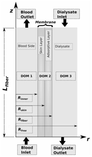 Following Happel’s free surface model [14], we have adopted the assumption that the unit cell is composed of three concentric cylinders: (a) a tube/blood side, (b) a membrane side, and (c) a shell/dialysate side. The inner cylinder of radius Rinner corresponds to the blood domain (DOM1) of the membrane; the membrane domain (DOM2) has thickness dmem and extends from a radial position Rinner to Rfiber = Rinner + dmem; and the cylindrical fluid envelope (DOM3) with free surface of radius Rfree, which encloses the dialysate fluid that flows in the countercurrent direction to the blood flow. This representation reduces the analysis of the entire dialysis module into the analysis of a single hollow fiber that consists of the three aforementioned domains shown in Figure 2. The membrane domain (DOM2) is further divided into two distinct layers, namely, the skin layer and the adsorptive layer that contains the carbon sorbents.