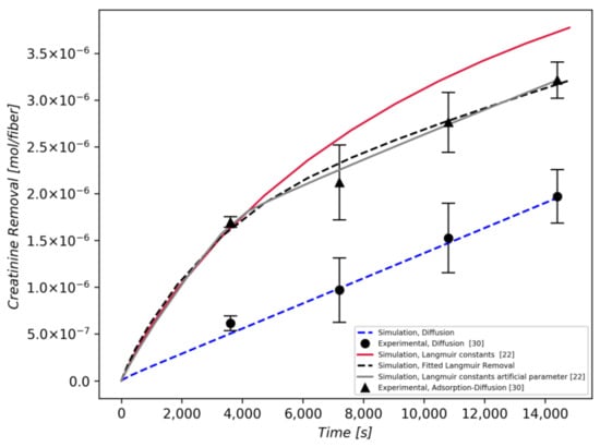 Figure 4. Comparison of numerically calculated removal of creatinine with the experimental dynamic adsorption-diffusion experiment for a 4-h treatment. Experimental data were extracted from [30]. Red and grey curves are obtained by utilizing Langmuir constants from Tijink et al. [22]; the black dashed curve is obtained by a fitting procedure.