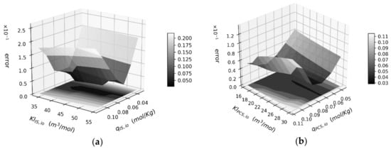 It was observed that the dissociation rate constant value affected drastically the removal and the error function value. This was attributed to the fact that for low values of the dissociation rate constant, the concentration gradient to drive the toxin transport through the membrane was weak, and the values of q t o x i n , 0 i , K l t o x i n , i became irrelevant as the sorption was negligible. On the other hand, high values of the dissociation rate constant increased the concentration gradient significantly, resulting in a total toxin removal that overestimated the experimental data to a great extent. The values of k d i s , I S , b l o o d = 0.7278 s−1 and k d i s , P C S , b l o o d = 1.81 s−1 provided the most appropriate concentration gradient for the removal of both toxins. The surface plots for the best-fitted apparent dissociation rate for IS and PCS are shown in Figure 5a,b, respectively.