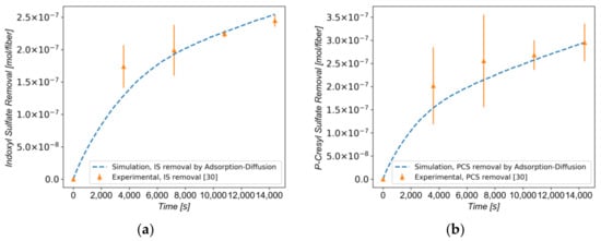 Figure 6. (a) Total removal curve for IS as predicted by the present model, compared with experimental data found in the literature [30] (b) Total removal curve for PCS as predicted by the present model, compared with experimental data found in the literature [30].