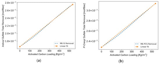 The results show a strong positive linear relationship between the activated carbon loading in the membrane and the protein-bound-toxin removal. The y-intercept in Figure 7a (that is, at zero particle loading) is 1.7 × 10−7 mol/fiber, whereas the slope reveals that 2.1 × 10−10 mol of IS are removed in each fiber per kg/m3 of AC loading. In Figure 7b, the y-intercept is 2.28 × 10−7 mol/fiber with the slope indicating that 1.63 × 10−10 mol of PCS are removed in each fiber per kg/m3 of AC loading. The simulations show that removal of both toxins is greatly enhanced by the increase of particle loading in the membrane matrix. Comparison of the cases with zero carbon loading and with 411.13 kg/m3 carbon loading (corresponding to the loading of the MMM, reported in ref [30]) shows that the adsorptive layer achieves a 52% improvement in IS removal, and a 31% improvement in PCS removal in comparison to diffusion alone. In addition, our model seems to estimate well the values for the removal of the PBTs solely by diffusion with commercial membranes. In fact, the Fresenius F8HPS® (Fresenius Medical Care, Bad Homburg, Germany), removed 187 mg/m2 of IS and 225 mg/m2 of PCS, while the predicted removal for the M6 membrane was 240 mg/m2 and 300 mg/m2, respectively [30]. Considering that the MMM had a three times lower ultrafiltration coefficient than the F8HPS, we can confirm the finding from the literature that there are no significant differences between the low-flux and the high-flux membranes [19] in the clearance of the PBTs in the absence of activated carbon in their matrices.