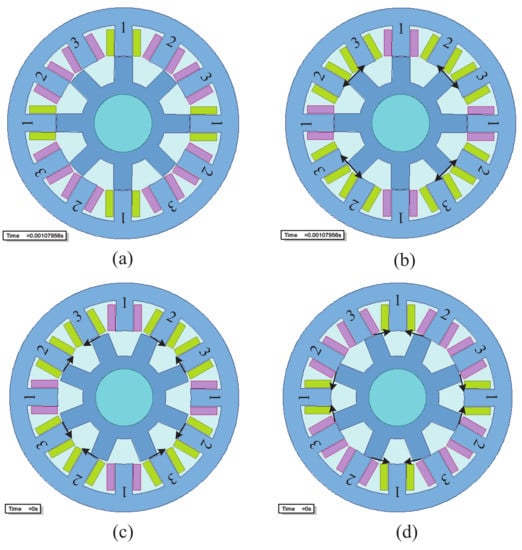 Cross-sectional view of the SRM with different rotor positions and excitation modes. (a) Exciting Phase 1 at 22.5°; (b) exciting Phases 2 and 3 at 22.5°; (c) exciting Phases 2 and 3 at 0°; (d) exciting Phase 1 at 0°.