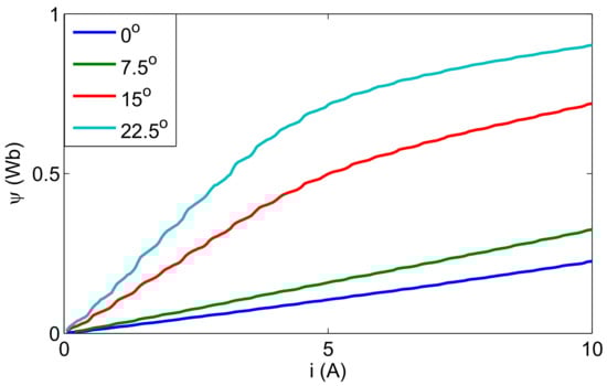 Combining Equations (1) and (2), the flux-linkage characteristics of the considered SRM at 0°, 7.5°, 15° and 22.5° are obtained and shown in Figure 3.