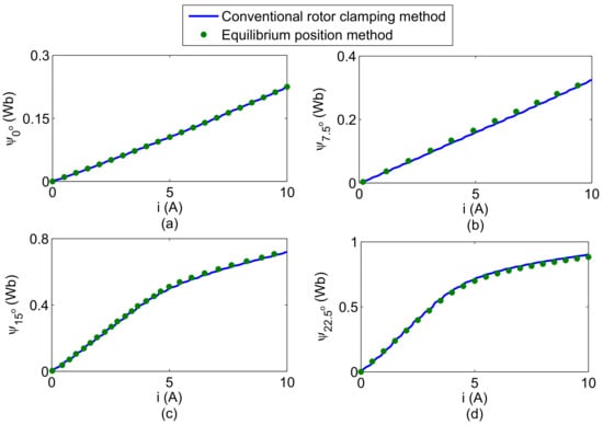 It should be noted that more than one phase is excited at the same time for measurement of the flux-linkage curves at 0°, 7.5° and 15°, which will result in mutual inductance between the excited phases. Although the mutual inductance introduces some errors to the measurement results, its influence is limited when the excitation form NSNSNSNSNSNSis adopted [21]. In order to verify the measurement accuracy, the comparison of the flux-linkage curves at four special positions between the equilibrium position method and rotor clamping method is shown in Figure 4. It can be seen that the results of the equilibrium position method and the rotor clamping method match closely, so the results of the equilibrium position method can be used for the modeling of the flux-linkage characteristic.