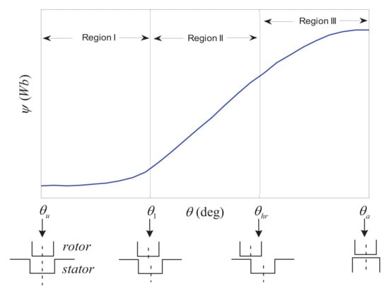Figure 5 shows the variation of flux-linkage with rotor position at specific current. In Figure 5, the flux-linkage curve can be divided into three regions, i.e., Region I [), Region II [) and Region III []. represents the unaligned position, which is defined as 0° in this paper; is the corner point, where the approaching corners of the stator and rotor poles are aligned; is a dividing point, where the approaching corner of the stator and center line of the rotor are aligned; represents the aligned position, which is 22.5° in this paper. It can be seen from Figure 5 that the flux-linkage exhibits an approximately linear relationship with the position in Region II. Therefore, as long as [] is included in [], the flux-linkage curve at the middle position can be calculated.