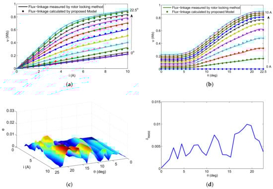 Entire flux-linkage characteristics. (a) Comparison of calculated and measured flux-current ( - i) characteristics; (b) comparison of calculated and measured flux-position ( - ) characteristics; (c) error between the calculated and measured flux-linkage; (d) root-mean-square error (RMSE).