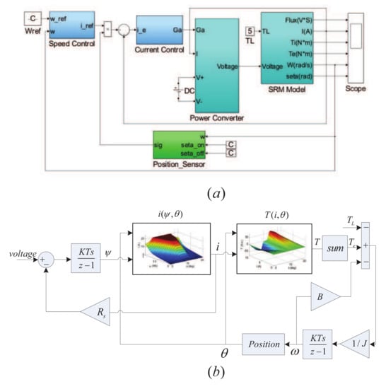 Simulation model of the SRM drive system. (a) System model; (b) SRM model for one phase.