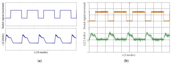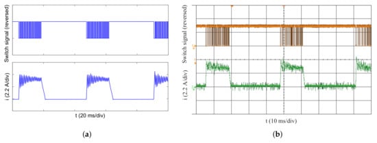 In addition, except the CCC operation, the dynamic simulation model can be also tested for voltage PWM mode. Figure 10a,b shows the simulation and experiment waveforms of the phase switching signal and phase current at the test condition of speed reference 650 r/min and load torque 1.5 Nm. The switching frequency and peak current are 10 kHz and 2.7 A, respectively. These waveforms indicate that the simulation and experiment results are in good agreement.