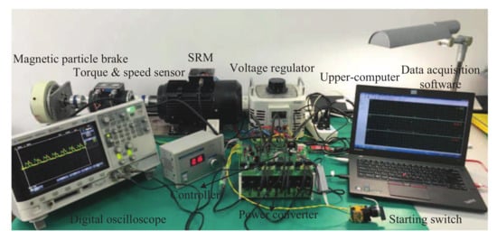 A SRM test bench is built to compare with the simulation results, as shown in Figure 11. Two experiments that keep the same conditions (i.e., using the same sampling frequency, operation mode, speed, load and turn-on and turn-off angle) as the simulation were implemented. The experiment results are shown in Figure 9b and Figure 10b.