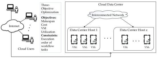 The cloud data center used in this study is represented by a set of heterogeneous VMs, where such that , as shown in Figure 1. Each VM has its own processing speed measured in Millions of Instruction Per Second (MIPS), memory in Megabytes (MB), storage space in MB, bandwidth in Megabits per second (Mbps), and cost per unit of time.