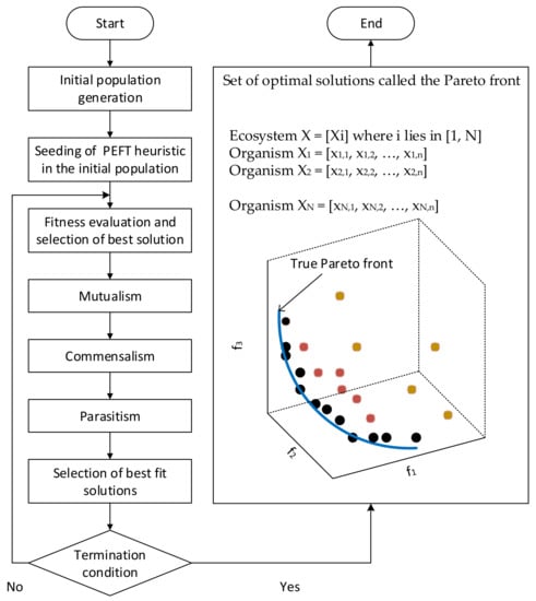 The optimization strategy is performed by applying the three search and update phases (i.e., mutualism, commensalism, and parasitism) to represent the symbiotic interaction between the organisms. The non-dominated organisms found along these phases are stored in an elite ecosystem. The three phases of the symbiotic relationships are described as follows.