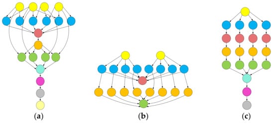 Experimentation was carried out with different real workflow applications published by Pegasus project, including Montage, CyberShake, Epigenomics, LIGO Inspiral Analysis, and SIPHT [43,44]. Montage is an input/output (I/O)-intensive astronomical application for constructing custom mosaics of the sky. CyberShake is a data-intensive application for generating probabilistic seismic hazard curves for a region. Epigenomics is a CPU-intensive workflow for automating various operations in genome sequence processing. LIGO Inspiral Analysis is a CPU-intensive workflow used for gravitational physics. SIPHT is a computation-intensive workflow used in bioinformatics for automating the search for untranslated RNA (sRNA) encoding-genes for bacterial replicons. Datasets of all the mentioned workflows are provided in the form of DAX files (https://confluence.pegasus.isi.edu/display/pegasus/WorkflowGenerator) in XML format. They are later converted to DAG-based workflows by using workflow management system framework tools, such as Pegasus [44]. Figure 3 shows the simplified representations of small instances of workflows used in our experiments and the characteristics of these workflows are presented in Table 4.