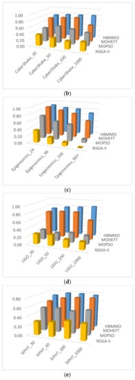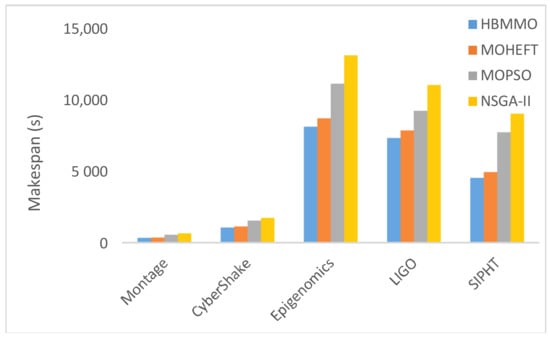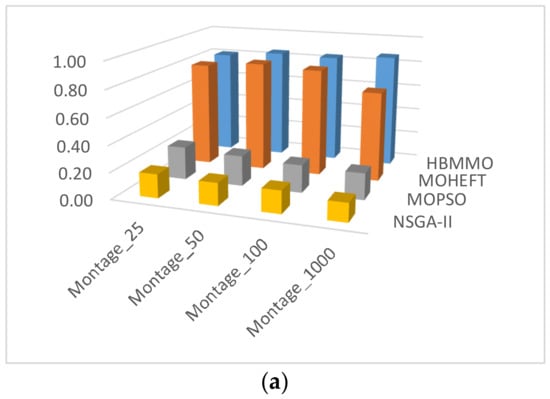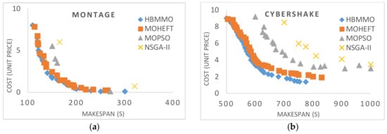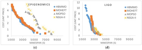 Figure 4 shows the multi-objective non-dominated solutions obtained for Montage, CyberShake, Epigenomics, and LIGO workflows, respectively. It shows that a lower makespan is correlated with a higher cost and vice versa. We can see that the solutions obtained using HBMMO have a better search ability due to the uniform distribution of solutions than those of MOHEFT, MOPSO, and NSGA-II. It can be seen that the Pareto fronts obtained using HBMMO are superior for all of the workflow instances under consideration. Even in the case of CyberShake, where MOHEFT performs significantly better, HBMMO is still able to maintain better convergence and a uniform distribution of solutions.