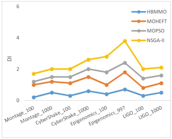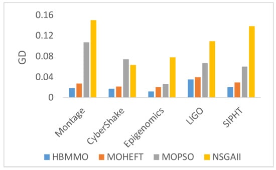 Figure 5 shows the results obtained by computing the mean GD for Montage with 25 tasks, CyberShake with 30 tasks, Epigenomics with 24 tasks, LIGO Inspiral Analysis with 30 tasks, and SIPHT with 30 tasks. It is observed that the GD value for the proposed HBMMO algorithm is lower as compared to other algorithms. It implies that the solution set generated by the proposed method has a better ability to converge towards the true Pareto front.