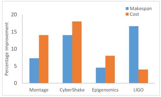 Figure 8 shows that HBMMO achieves a better average makespan than the comparative algorithms for all of the benchmark workflows. Figure 9 shows the improvement rate of HBMMO over the MOHEFT algorithm in terms of makespan and cost of the workflow applications. In the case of makespan, the HBMMO gains an improvement by 7.26%, 14.04%, 4.54%, and 16.6% compared with the MOHEFT, using the Montage, CyberShake, Epigenomics, and LIGO workflows, respectively. The cost of HBMMO was better by 14%, 18%, 8%, and 4% over the MOHEFT algorithm in the case of the Montage, CyberShake, Epigenomics, and LIGO workflows, respectively.