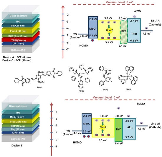 - Tang, C.W.; VanSlyke, S.A. Organic electroluminescent diodes. Appl. Phys. Lett. 1987, 51, 913–915. [Google Scholar] [CrossRef]