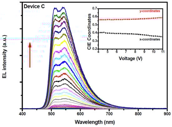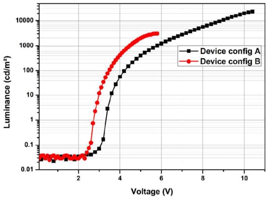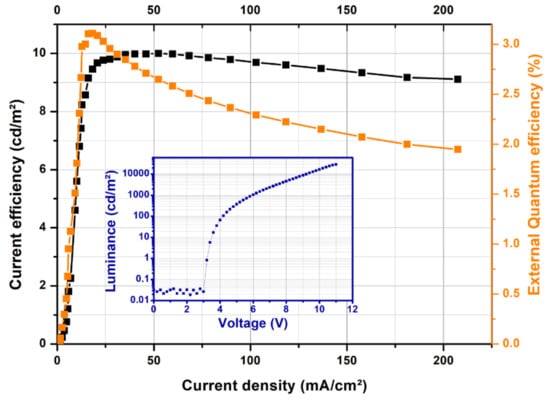 | Device Configuration | Vturn-on [a] | CIE (x,y) [b] | λEL (nm) | L (cd/m2) | Current eff. (cd/A) [c] | Power eff. (lm/W) [c] | EQE (%) [c] |