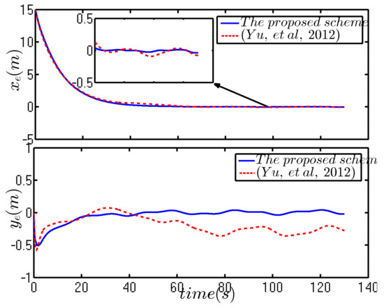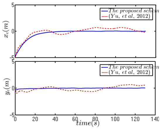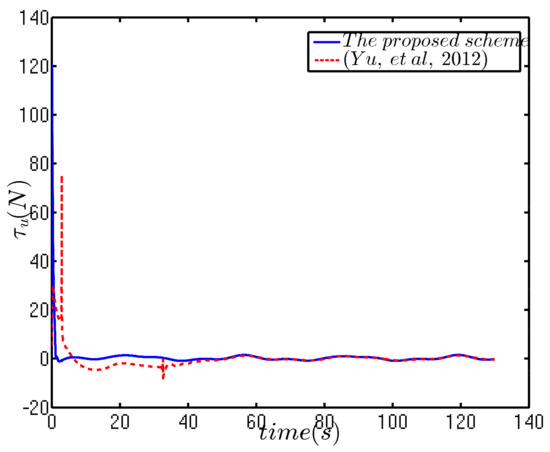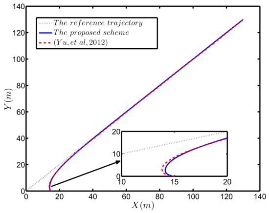 In the previous approach [45], the straight line trajectory cannot be tracked because of the requirement of zero-yaw velocity. First, a simple straight line is regarded as a reference trajectory, which is described as , . According to [42,43,44], the external disturbances are assumed to be , , , that is a time-varying disturbances. Meanwhile, , and . The initial state of USV is . The control parameters used in the controller are , , , , , , , , , , and . The comparison results of the numerical simulation are provided in Figure 3, Figure 4, Figure 5 and Figure 6.