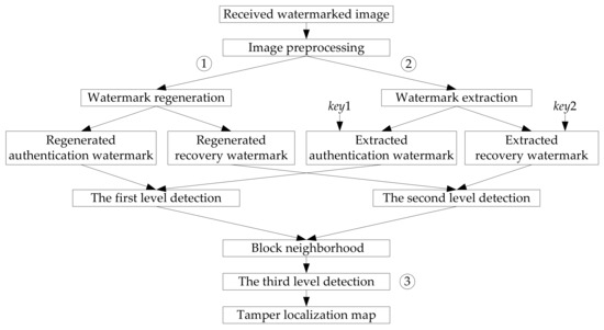 In the receiving or detection side, the received image might be tampered by potential attackers. To detect and locate the tampered regions, a three-level tamper detection strategy [25] is applied in the proposed method, which is shown in Figure 3.