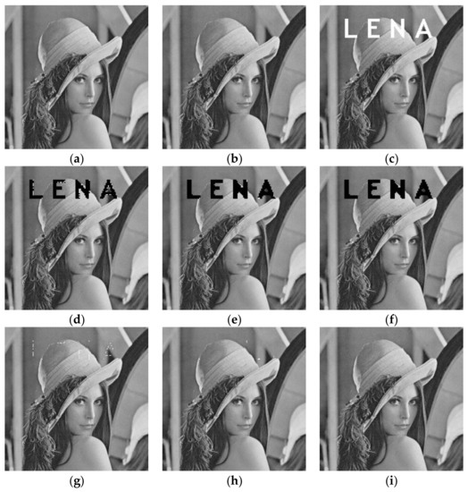 Tamper detection and recovery performance for text addition attack: (a) Original Lena image; (b) watermarked Lena image; (c) attacked image; (d) tamper detection result using the method in [13]; (e) tamper detection result using the method in [25]; (f) tamper detection result of the proposed method; (g) image recovery result using the method in [13]; (h) image recovery result using the method in [25]; (i) image recovery result of the proposed method.