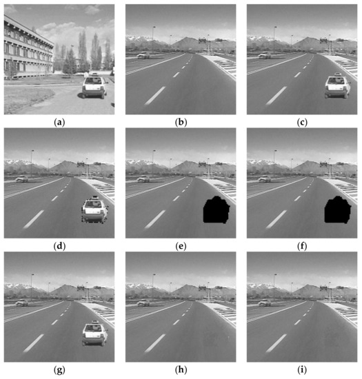 Collage attack introduced in [36] is a special attack for the watermarking method based on block-independent. Figure 8 gives the tamper detection and recovery performance for collage attack. A car from watermarked Car1 image (Figure 8a) is copied and inserted into watermarked Car2 image (Figure 8b) without changing its relative location. The detection results in Figure 8d–f indicate that the proposed method and [25] can resist the collage attack and locate the splicing area successfully. Only the border of the tampered area is detected in Figure 8d. The reason is that the method proposed in [13] does not break the block-independent characteristic during watermark generation and embedding processes. From the restored images shown in Figure 8g–i, it can be observed that both the proposed method and [25] can restore the tampered image with good subjective quality. The watermarking method in [13] cannot reconstruct the tampered regions due to the fact that the collage attack has been survived from the detection process. From Table 5, we can see the recovered images obtained by the proposed method and [25] have similar PSNR values. However, compared to [25], the FNR of the proposed method is much lower, which suggests a better tamper localization result.