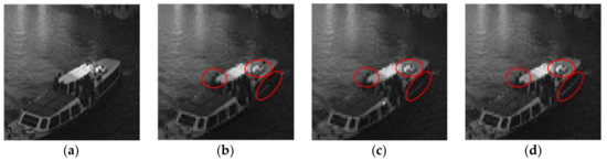 Partial enlarged details of the restored images: (a) Original ship image; (b) restored ship image using the method in [13]; (c) restored ship image using the method in [25]; (d) restored ship image of the proposed method. To highlight the differences among these restored images, some regions in restored images are selected and circled in red.
