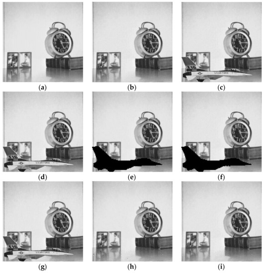 Tamper detection and recovery performance for content-only attack: (a) Original Clock image; (b) watermarked Clock image; (c) attacked Clock image; (d) tamper detection result using the method in [13]; (e) tamper detection result using the method in [25]; (f) tamper detection result of the proposed method; (g) image recovery result using the method in [13]; (h) image recovery result using the method in [25]; (i) image recovery result of the proposed method.