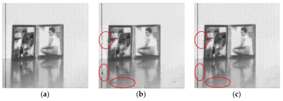 Figure 11 shows the algorithm performance comparisons for content-only attack. The airplane is inserted into the watermarked Clock image without changing its watermarking bits. From the detection results presented in Figure 11d–f, we can observe that reference [13] has failed in detecting this attack. This is because its generation processes of authentication watermark and recovery watermark are mutually independent, which gives a chance for content-only attack. The proposed scheme and the method in [25] avoid this shortcoming and achieve similar detection results subjectively. Due to the authentication failure, the attacked image in [13] cannot be recovered. To make a better comparison for the restored images, Figure 12 exhibits the partial enlarged details of the restored images shown in Figure 11h,i. As shown in the enlarged drawing, there are some image blocks (as circled in red) that are unnaturally distributed in the restored image of reference [25]. Besides, compared to reference [25], the restored image by the proposed scheme is much closer to the original image.