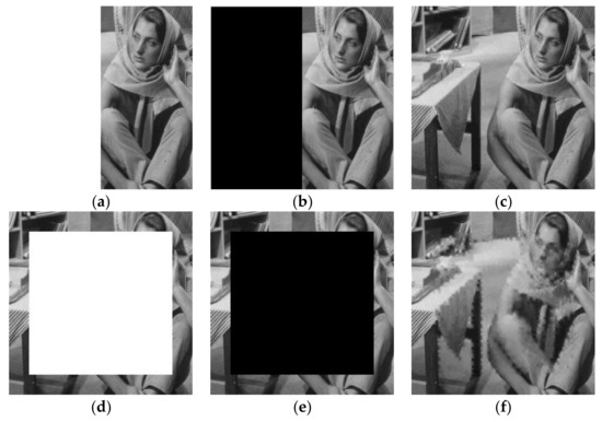Large area tampering test: (a) Left 50%; (b) tamper detection result; (c) recovered image (PSNR = 32.05 dB); (d) middle 80%; (e) tamper detection result; (f) recovered image (PSNR = 19.69 dB).