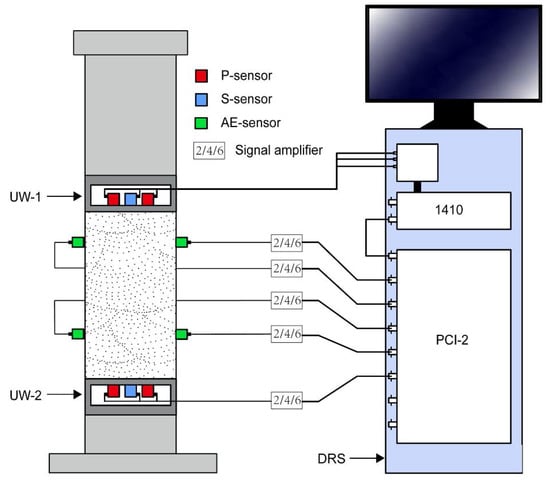 Part 3, Data Recording System (DRS): the DRS included a personal computer (PC), a high-voltage signal transmitting card (Model ARB-1410, produced by the Physical Acoustics Company), and signal receiving cards (Model PCI-2, produced by the Physical Acoustics Company). ARB-1410, which was connected with UW-1, can emit different types of ultrasonic signals with enough power to overcome the energy attenuation in the spread process; the emission time interval, cycle time, and signal energy can be set by experimenters. PCI-2 was connected with UW-2 and the AE sensors, and they were used to record the ultrasonic wave and AE signals.