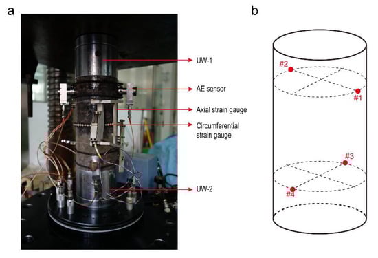 (1) First, UW-1 and UW-2 were set at each end of the rock samples with the same direction, and axial and circumferential strain gauges were placed around the sample to record deformation information. AE receivers were arranged at designed locations to monitor AE activity (Figure 3).