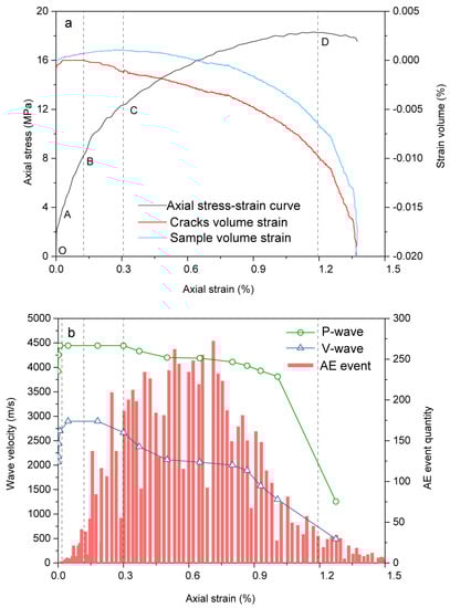 (a) Axial stress–strain relationship for sample SA-2 under uniaxial compression; (b) the relationship between ultrasonic velocity and AE activity for sample SA-2 under uniaxial compression.