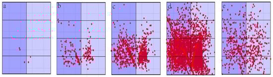 AE locations in sample SA-2 during different deformation stages; (a) compression fissures stage; (b) linear deformation stage; (c) stabilized-growth crack stage; (d) accelerated-growth cracks stage and (e) after peak stress stage. The purple part was the rock sample; the black grid helped to locate AE positions; the red spots represented the location of AE enents.