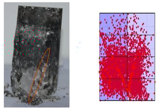 During testing, four AE sensors were used to locate the AE position, which clearly showed damage development inside the rock samples. From the compression fissures to accelerated-growth cracks stage, AE gradually became active and reached a peak, the AE located in the area with the most significant damage (Figure 6). In the uniaxial compression test, most of macro-cracks were parallel to the direction of stress, which presented a vertical splitting characteristic as shown in Figure 7. More serious damage and inconsistent distortions occurred in the lower part of the rock, as the loading stress came from the base of the test machine. Comparing the damaged salt rock after testing with AE events location (Figure 7), we clearly recognized that the location of the AE was in good agreement with the macro-cracks of the damaged samples. Where the damage was most serious, AE events were the most concentrated.