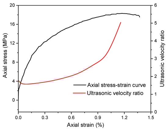Relationship between axial stress-strain curve and ultrasonic velocity ratio at different deformation stages for sample SA-2 under uniaxial compression.