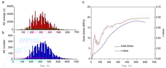 where is the sum of the AE numbers and is the accumulated AE energy. In this study, AE energy was obtained by integrated hardware electronics of a PCI-2 Card (Figure 10a). The wavelets of AE numbers with loading time (Figure 10b) show that AE number and energy had different peaks. AE number peak occurred at 236 s, the beginning of the accelerated-growth cracks stage; while AE energy peaked at 345 s, the middle of the accelerated-growth crack stage. The curve between r-value and loading stress increased at first, declined later, and then gradually rose again (Figure 10c). In the beginning of testing, AE events were rare; however, they carried a certain amount of energy. Therefore, the r-value had a rising trend. It then declined when no energy was released during the compression fissure stage. After that, the r-value began to rise, indicating that energy was not released only by several events, but a great many rhythmic AE events with uniform energy. In contrast to other deformation stages, the r-value presented a slow rising character in the accelerated-growth crack stage, which implied that AE number and energy had consistent changes; in other words, energy release channels were unobstructed because of serious damage.
