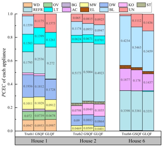 - Comparison of two GSP-based methods, GSQF-APD and GLQF-APD [40]. In this experiment, we compare the two approaches in two sections. In the first section, we compare the classification performance for House 2 of the two methods. The corresponding results are reported in Figure 4, where the precision, recall, and F-Measure are reported in Figure 4a–c, respectively. The values are related to Table 1, which is very informative about details of each appliance’s classification result and the absolute improvement of three classification metrics. Firstly, contrasting Step 1 and Step 2 of the GSQF-APD algorithm, we can see that the Step 2 performs better than Step 1 in classification accuracy, where the precision, recall, and F-measure of most appliances are significantly improved. It further illustrates that Step 2 simultaneously reduces the FP and FN events that occurred in Step 1 by using the SA algorithm to refine the results. Then, we observe that although the GLQF-APD algorithm (Solution 1 and Solution 2) produces a relatively high precision, it leads to significantly worse recall and F-measure performance than the GSQF-APD algorithm, especially for the low power appliances, for instance, lighting. In addition, note that for the GLQF-APD algorithm, the recall does not improve in Solution 2 compared with Solution 1, which indicates that the FN events are not decreased. Overall, our proposed GSQF-APD shows that average F-measure value for House 2 is 0.87, which is better than the GLQF-APD approach that shows F = 0.75 for the same house. Thus, we can conclude that the proposed method is more accurate than GLQF-APD in classification.