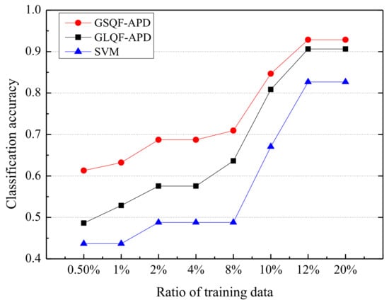 - Comparison with the state-of-the-art NILM approaches: First, a comparison of average classification accuracy of GSQF-APD with GLQF-APD and SVM-based approach for House 2 is shown in Figure 6. We can see that the two GSP-based algorithms, GSQF-APD and GLQF-APD, achieve higher accuracy than the SVM-based method, especially when the ratio of training data is small (under 8%), the difference of classification accuracy can exceed 20%. This observation demonstrates that the GSP-based approach reduces the dependence on training data compared with the SVM-based method. Furthermore, the GSQF-APD approach that uses the graph shift-based regularization term outperforms the GLQF-APD approach that introduces the Laplacian quadratic form as a regularization term. The classification accuracy gap between GSQF-APD and GLQF-APD varies from 2% to 13%. Note that the curve obtained by the SVM-based method presents a relatively obvious step-characteristic, which is due to the fact that training data in a certain interval contains the same number of useful labels.