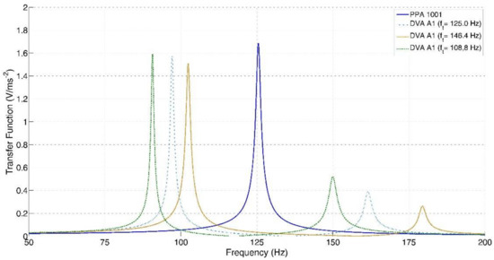 Figure 13b shows that ITD2 is able to lower the frequency of the main resonance peak to 89.7 Hz and to create a second resonance peak at double frequency (179.5 Hz). The heights of the two peaks are 1.5 V/ms−2 and 0.57 V/ms−2 respectively.