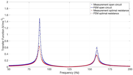 Validation of the numerical model, FRFs of PPA 1001 in open circuit and with optimal load resistance.