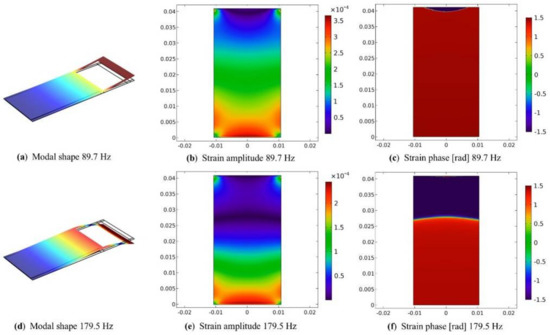 Figure 14 shows the strain in the upper plane of the PZT layer of the harvester with ITD1. Edges of structural material surround this active layer. The strain component in the longitudinal direction is represented, since it is the most important strain component caused by harvester bending. The color maps show both the amplitude and phase of strain. Strain node lines [37], which are the lines on the surface of the PZT layer where the strain changes sign, are represented by light lines in the phase plots.