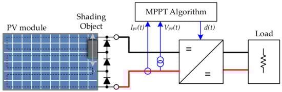 When particular shading conditions occur on a PV generator, one or more bypass diodes can be forward biased to prevent localized power dissipation at the shaded cells. The bypass diodes forward or reverse bias state under partial shading depends on the PV generator output voltage, resulting in modified P-V curves with multiple local maxima. Thus, the MPPT algorithm running in the control unit must be adapted or modified when designing an algorithm suitable to operate in the case of partial shading and rapidly changing environmental conditions.