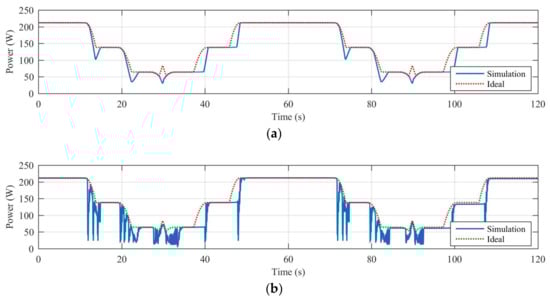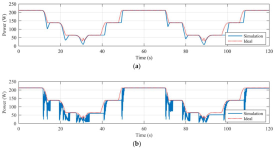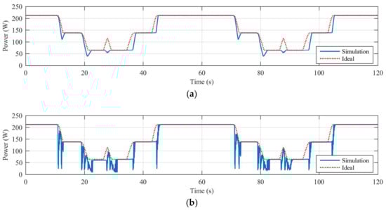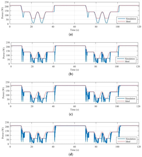 Finally, Table 6 reports the efficiency calculated for all the dynamical shading scenarios characterized by the Trapezoidal-C shape’s objects. Figure 10 shows, as example, the diagrams of the harvested power (solid blue line) and maximum harvestable power (dotted red line) obtained in case of dynamical shading caused by the trapezoidal-A shape 4 × 1 shading object and controlling the off grid PV system, with the best performing traditional MPPT algorithm (P&O—A) and the best performing PSO-based MPPT algorithm (PSO—5p).