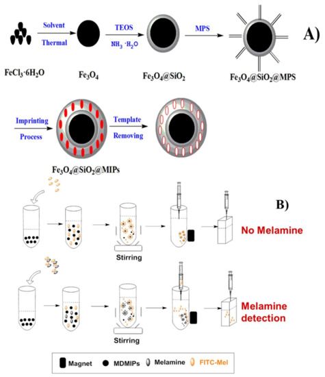 Based on the above, we designed a novel magnetic dummy molecularly imprinted polymer (MDMIP) for fluorescence detection of melamine in milk. The principle is based on competitive absorption between a melamine molecule and a fluorescein isothiocyanate (FITC)–melamine (FITC-Mel) conjugate on the surface active sites of the MDMIPs. The MDMIPs were prepared on the surfaces of Fe3O4@SiO2 to absorb specifically melamine molecules. The MDMIPs were characterized, and their adsorption capacity was evaluated based on their static adsorption and Scatchard analysis. Competitive binding between FITC-Mel and melamine was used for quantitative detection of melamine in spiked milk samples. Compared to the above-mentioned melamine detection methods, the detection method established in this paper needs no sophisticated experimental procedure and instruments. In addition, the present competitive fluorescence assay based on MDMIP is simpler than current Quantum Dots-MIP ( QDs-MIP) fluorescent sensors with embedding of fluorescent QDs into the MIPs.