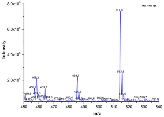 FITC-Mel was examined using ESI-MS in positive- and negative-ion modes. The molecular weights of FITC and melamine are 389.38 and 126.12, respectively. Figure 2 shows that FITC-Mel has three hydroxyl and two amino groups. In positive-ion mode, the molecular ion peak should appear at 516.5 (M + H)+ or 517.5 (M + 2H)2+, but we did not observe this molecular ion peak. In negative-ion mode, the molecular ion peak should appear at 514.5 (M − H)−, 513.5 (M − 2H)2−, or 512.5 (M − 3H)3−. Figure 2 shows a molecular ion peak at 512.8, corresponding to FITC-Mel and indicating successful combination of FITC and melamine. In the previous literature [48], a commercial fluorescent, 5-(4,6-dichlorotriazinyl) amino fluorescein (DTAF) was used as fluorescent label and structural analog to monitor melamine by performing directly competitive adsorption. However, there is a relatively large difference in structure between DTAF and melamine, which restricts the sensitivity and selectivity of the fluorescent assay. In this work, we prepared FITC-Mel as a novel fluorescent label by combining FITC and melamine using chemical modification. The structure of FITC-Mel has a melamine molecule which will endows it high similarity and provides the fluorescent MIP sensor developed in this paper with good recognition and sensitivity.