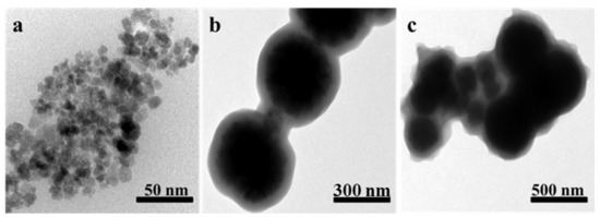 TEM images of (a) Fe3O4; (b) Fe3O4@SiO2; and (c) MDMIPs.